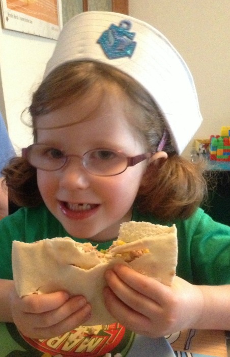 The Tuna Trawlermen sandwich was quick to make, however we found the pittas difficult to hold together – not the end of the world but I do like a pitta to hold its contents! We put low-fat spread in each half, added cheese and salad and added tuna and sweetcorn (or quorn in my case) and a bit of red onion. I liked that the pittas are broken into two and come in a circular shape